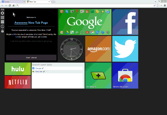 The default page starts out with a tutorial tile on how to use the extension, basic shortcuts tiles to common sites like Facebook, Twitter and Amazon, widgets tiles like a clock and open tabs list, a shortcut tile to the Chrome web store and to more awesome widgets and then there’s the Google tile which contains shortcuts to several of Google’s products making it easy to access any of them right from the new tab page. The only downside is that this tile cannot be configured separately to add or remove any of the Google products but its not a big deal so long as the extension developer keeps it updated with new products and eliminates those that have been retired.
